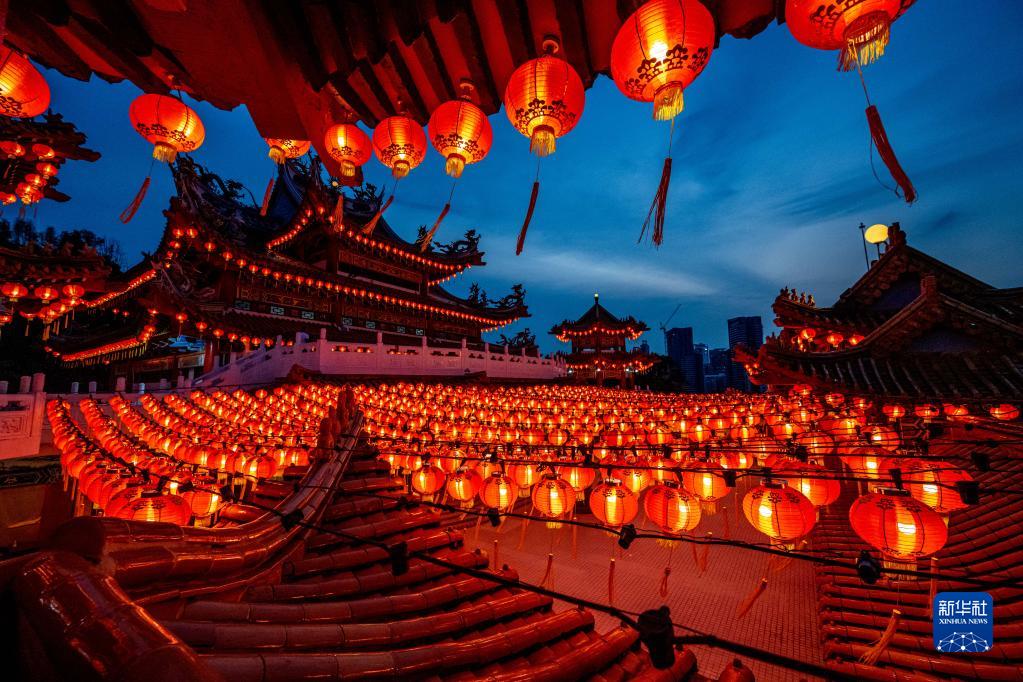 馬來(lái)西亞吉隆坡天后宮從13日開(kāi)始每晚點(diǎn)亮6000只紅燈籠,迎接農歷癸卯兔年的到來(lái)。