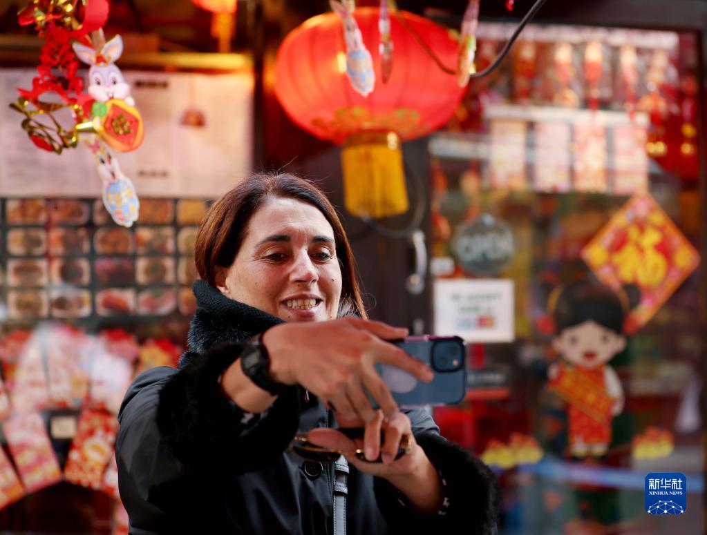 1月20日,一名女子在英國倫敦中國城自拍留念。