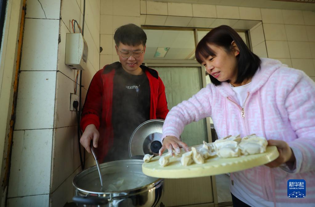 1月20日,沈陽(yáng)工學(xué)院老師和李天騏(左)一起煮餃子。