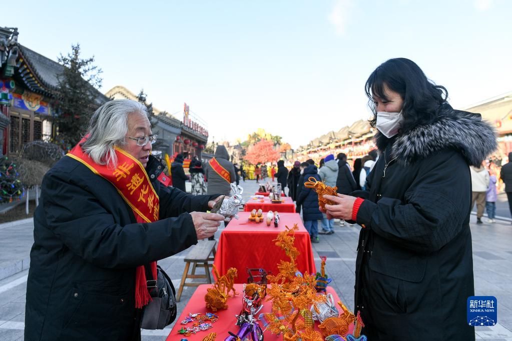 1月21日,非遺傳承人賈茂田(左)在惱包村美食街向游客介紹金屬絲編織技藝。