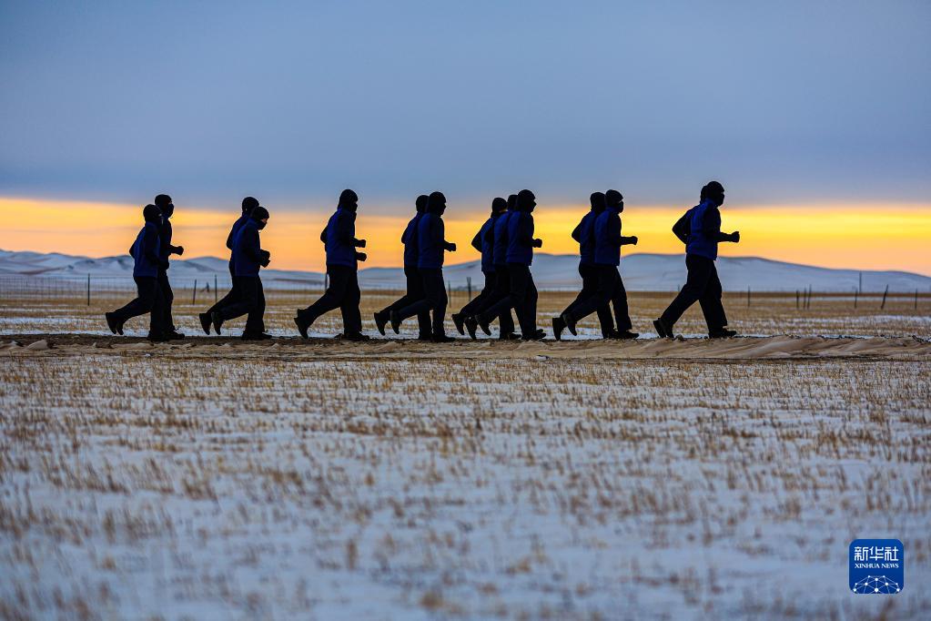 1月7日,西烏珠穆沁旗消防救援大隊的消防員們在雪地上跑步訓練。