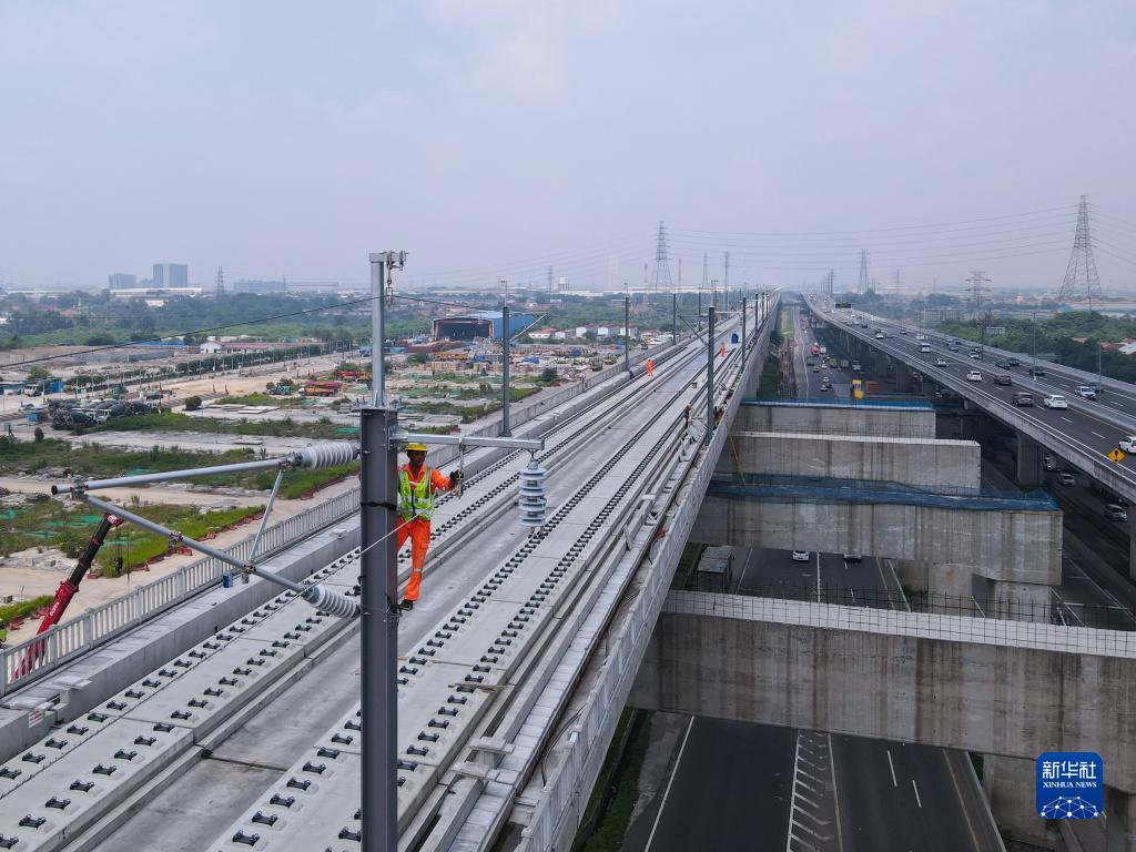 1月21日,在印度尼西亞勿加泗雅萬(wàn)高鐵沿線(xiàn),中鐵電氣化局印尼雅萬(wàn)高鐵項目部施工人員進(jìn)行高鐵接觸網(wǎng)附加線(xiàn)架設工作(無(wú)人機照片)。