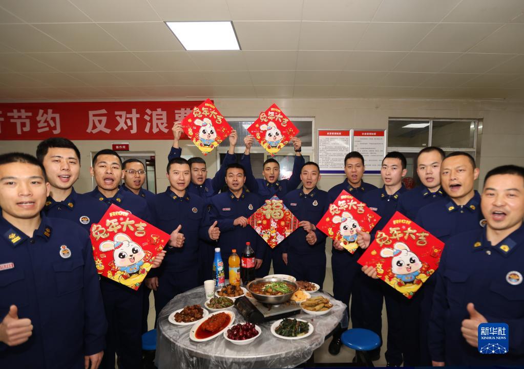 1月21日,湖北省武漢市洪山區徐東路消防救援站的消防員在集體年夜飯前合影留念。