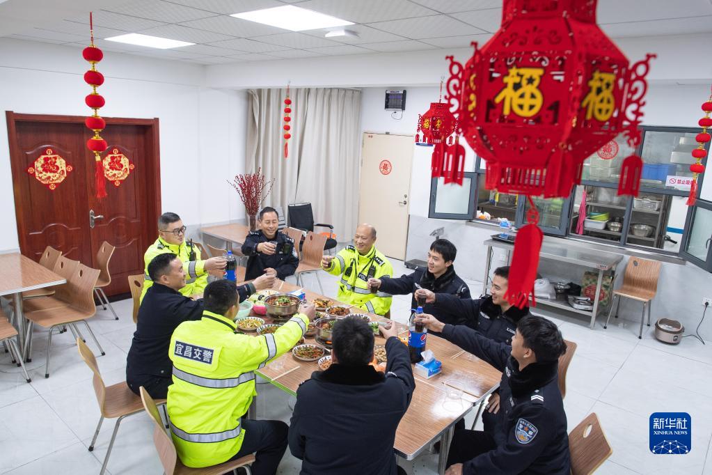 1月21日,值班民警、輔警在湖北省宜昌市東山派出所食堂吃年夜飯。