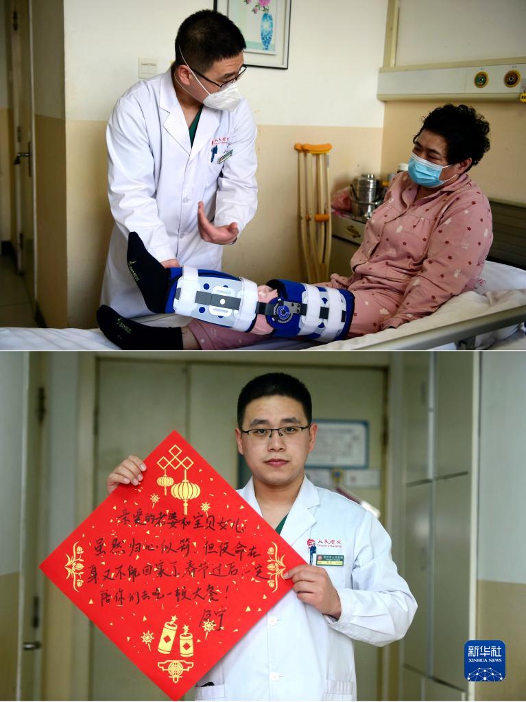 拼版照片:1月21日,滄州市人民醫院骨四科醫生及寧為患者查體(上圖);及寧寫(xiě)的“致歉語(yǔ)”:“親愛(ài)的老婆和寶貝女兒:雖然歸心似箭,但使命在身又不能回家了,春節過(guò)后一定陪你們吃頓大餐”(下圖)。