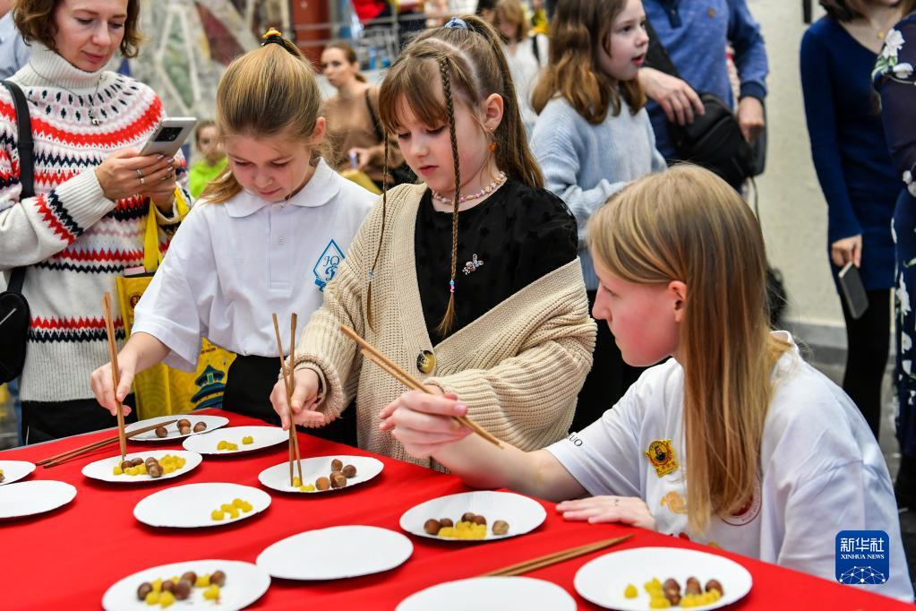 1月21日,兒童在俄羅斯莫斯科的迎新春活動(dòng)上學(xué)習使用筷子。
