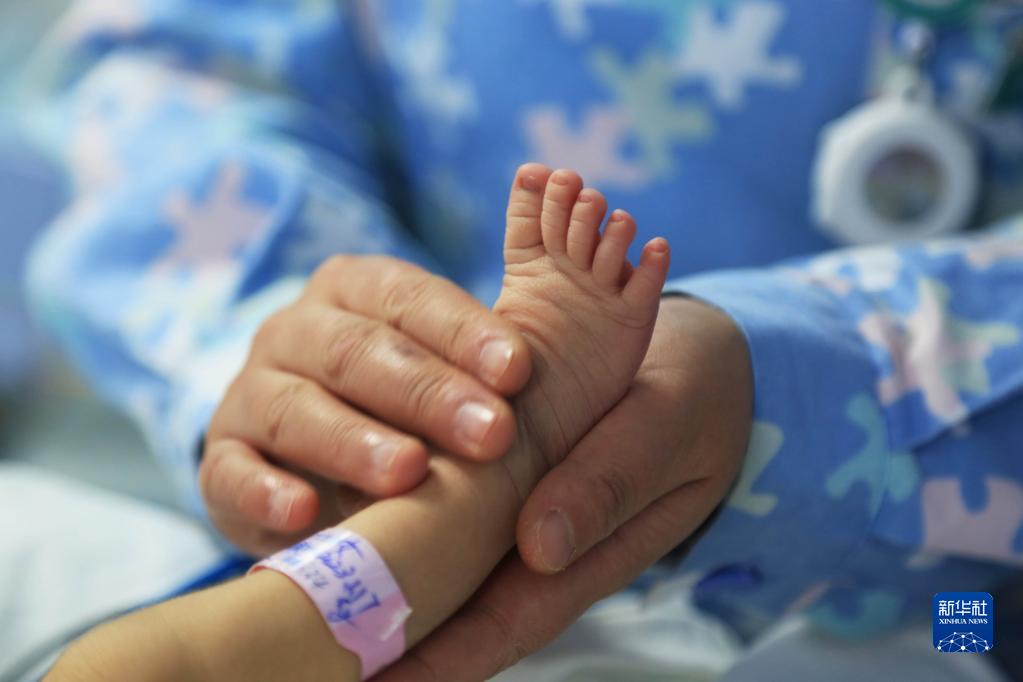 1月21日,甘肅省定西市第二人民醫院新生兒重癥監護室的護士在給新生兒按摩。
