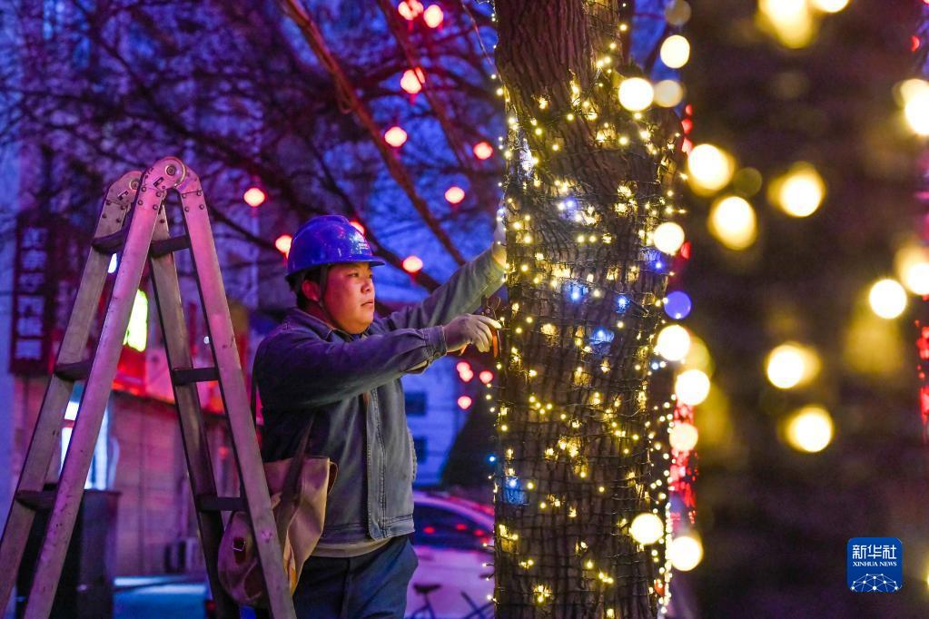 1月21日清晨,工作人員在河北省遷西縣城區路旁檢修樹(shù)干上的串燈。