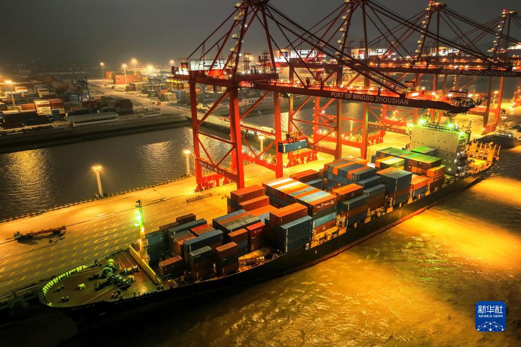 1月22日晚, “盛城”號集裝箱班輪在浙江寧波舟山港金塘港區作業(yè)(無(wú)人機照片)。