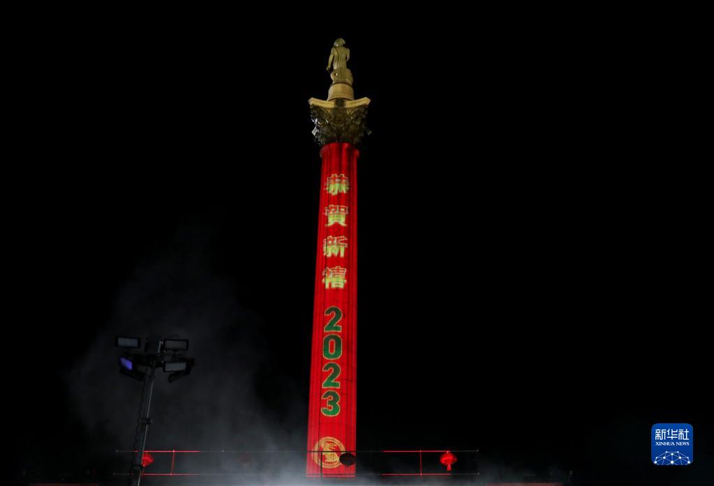 1月21日晚,英國倫敦特拉法加廣場(chǎng)納爾遜紀念柱的柱身出現“恭賀新禧2023”字樣。