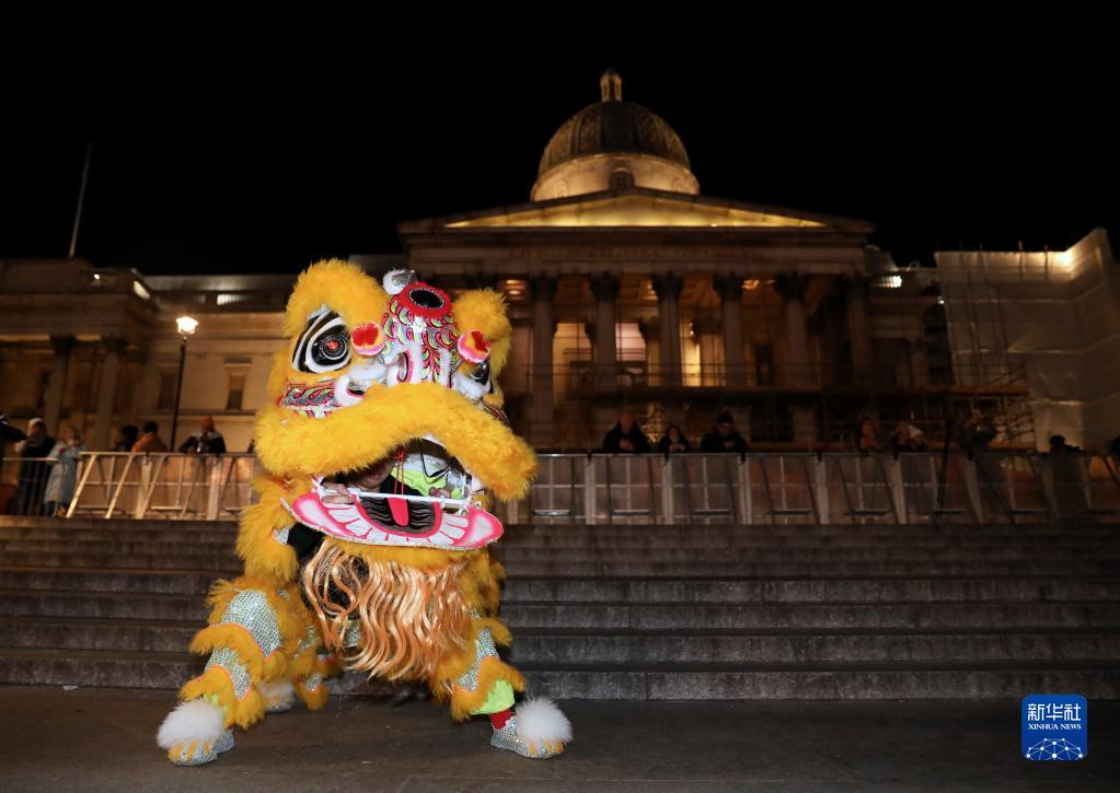 1月21日晚,演員在英國倫敦特拉法加廣場(chǎng)表演舞獅。
