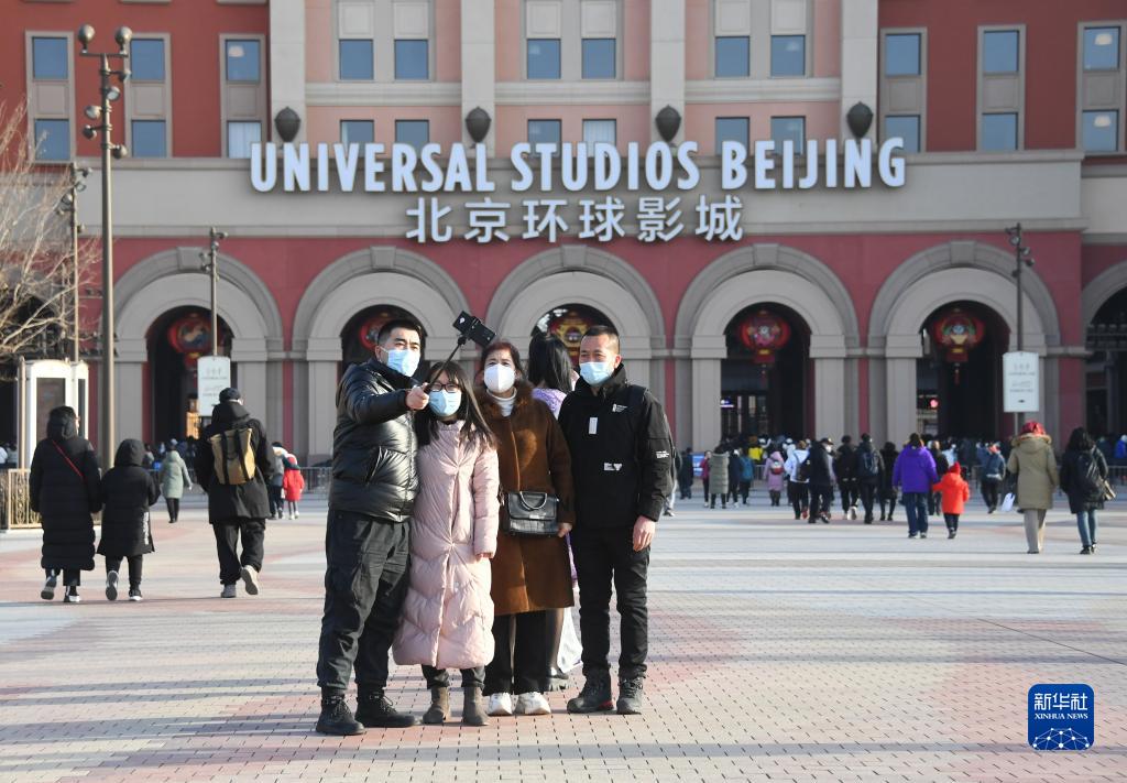1月22日,游客在北京環(huán)球影城城市大道拍照。