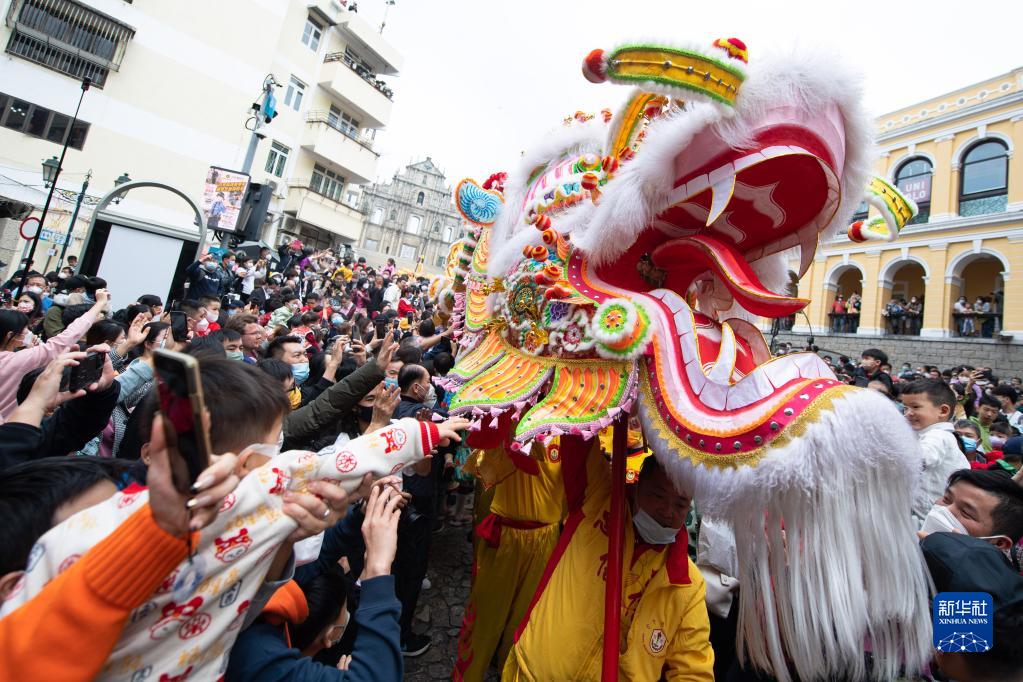 1月22日,舞龍隊伍在澳門(mén)大三巴牌坊前表演。