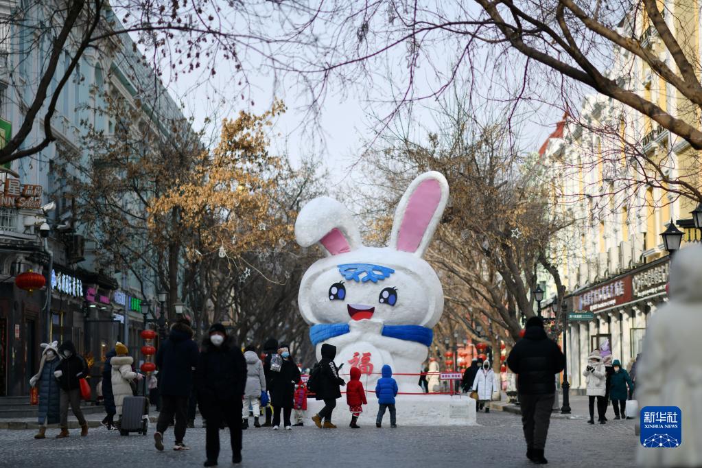 1月22日,在黑龍江哈爾濱中央大街,游客在游玩拍照。