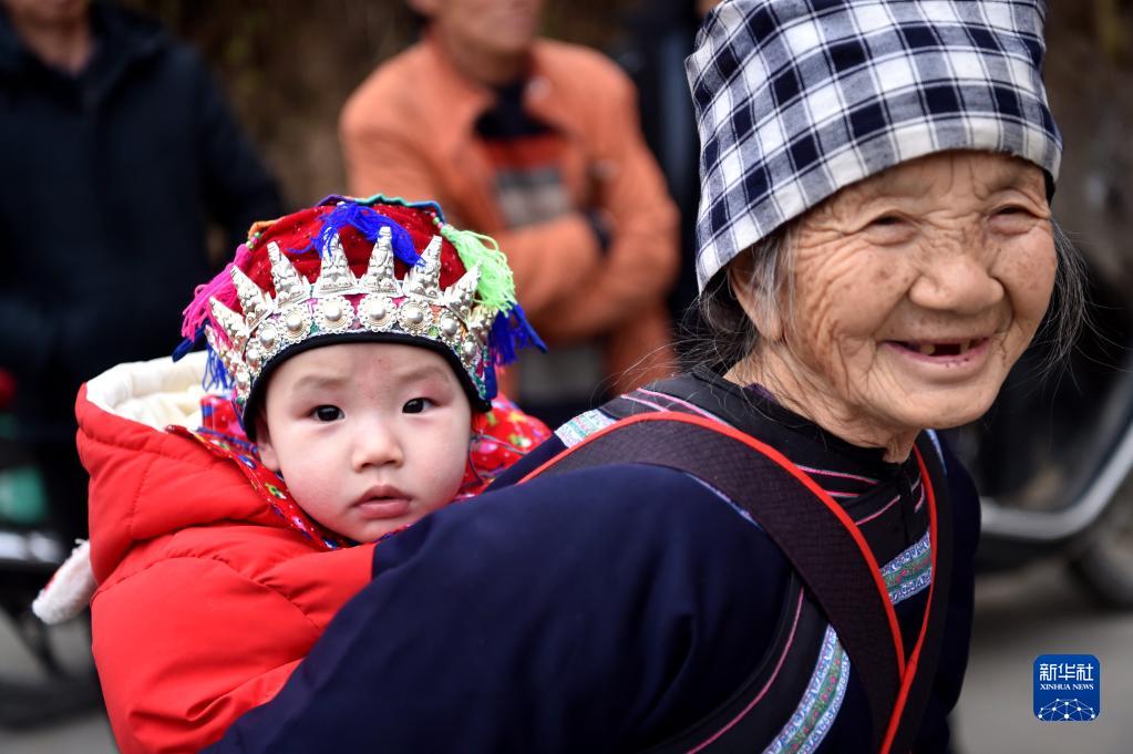 1月22日,在貴州省榕江縣栽麻鎮歸柳村,老人背著(zhù)小朋友觀(guān)看鬧新春活動(dòng)。