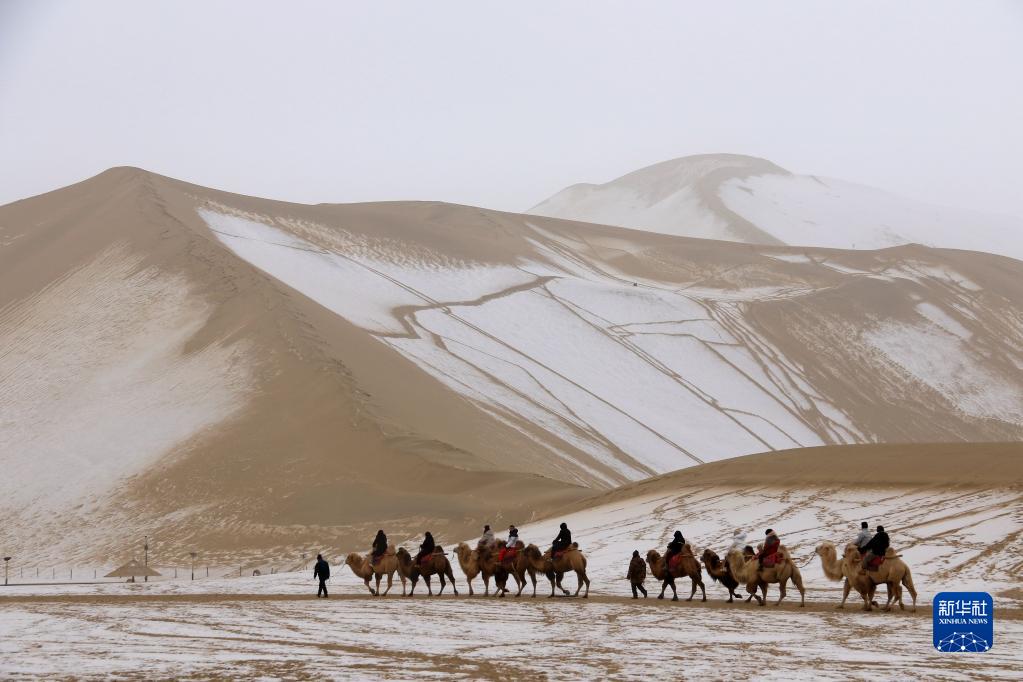 1月22日,游客在甘肅省敦煌市鳴沙山月牙泉景區游覽。