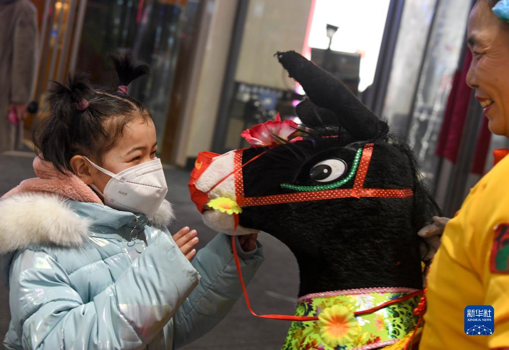 1月22日,在位于新疆烏魯木齊的天山萬(wàn)科廣場(chǎng)內,小朋友與民間社火團隊演員互動(dòng)。