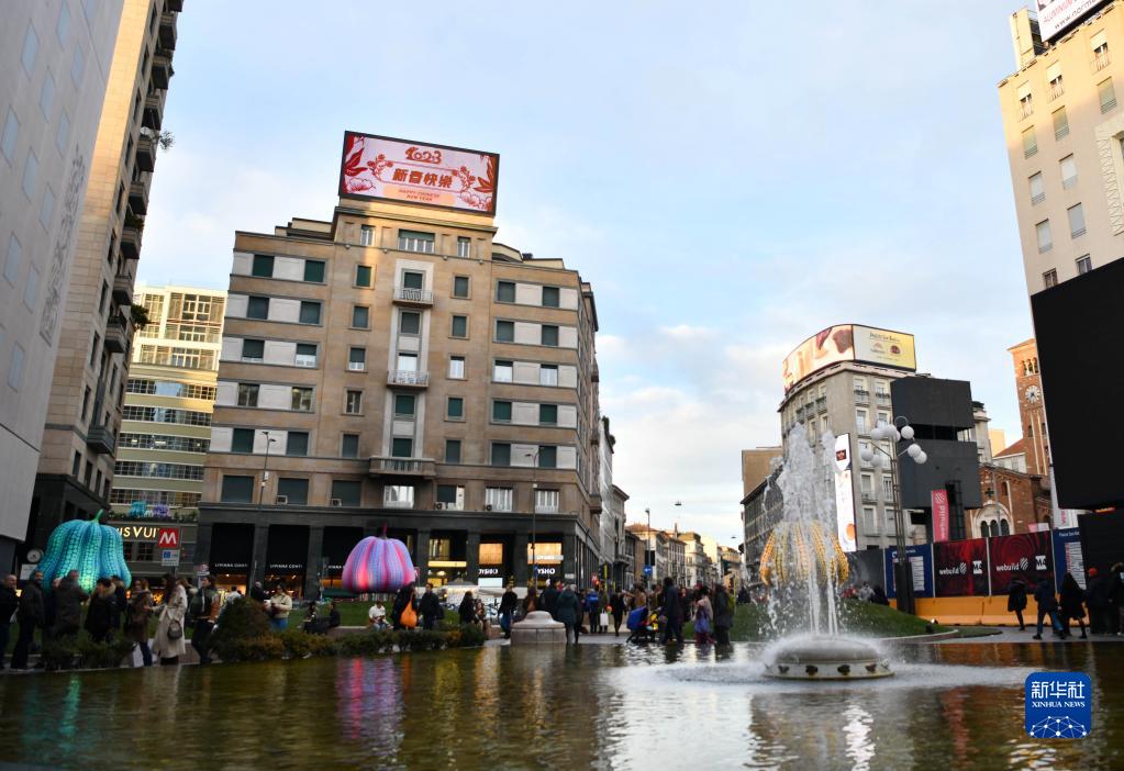 1月21日,意大利米蘭圣巴比拉廣場(chǎng)建筑上方的大屏幕循環(huán)播放兔年春節動(dòng)畫(huà)。