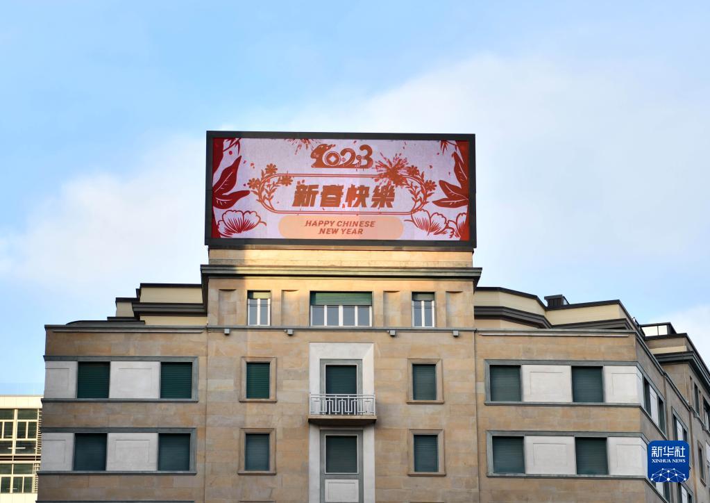 1月21日,意大利米蘭圣巴比拉廣場(chǎng)建筑上方的大屏幕循環(huán)播放兔年春節動(dòng)畫(huà)。
