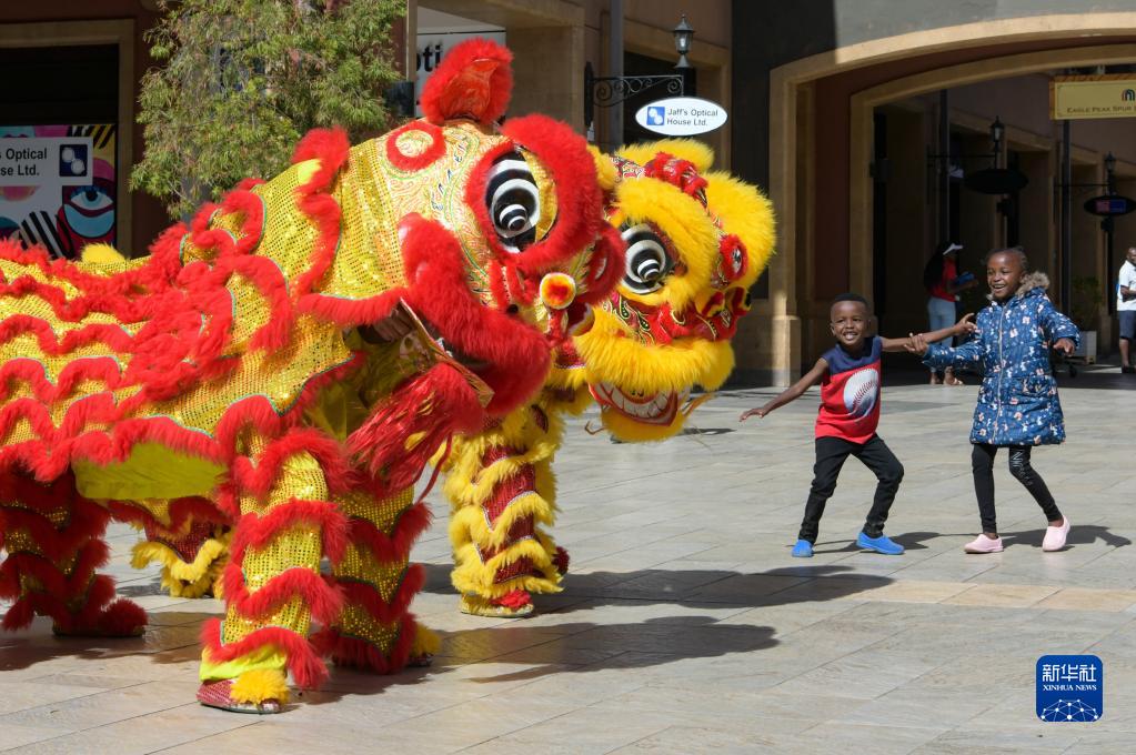 1月21日,孩子在肯尼亞首都內羅畢觀(guān)看舞獅表演??夏醽唭攘_畢大學(xué)孔子學(xué)院在內羅畢市區一購物中心設春節文化體驗展臺,展示中國文化傳統活動(dòng),吸引游人參與。