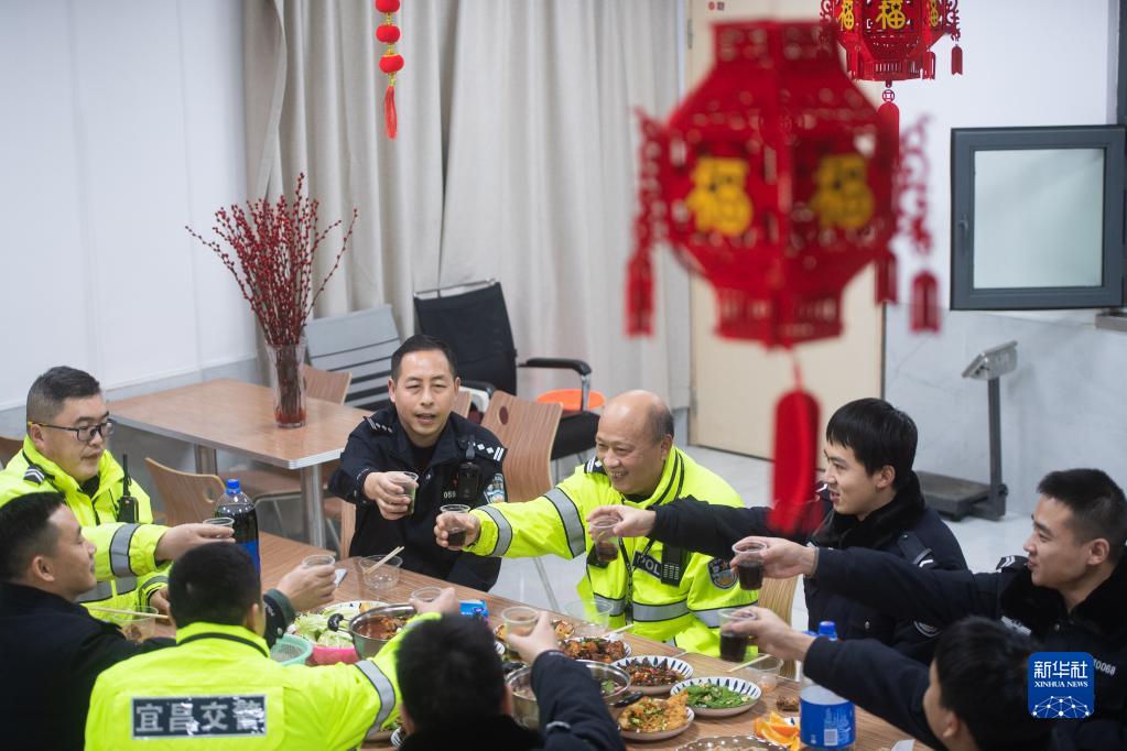 1月21日除夕夜,梅大順(中)與值班的民警、輔警在湖北省宜昌市東山派出所食堂吃年夜飯。