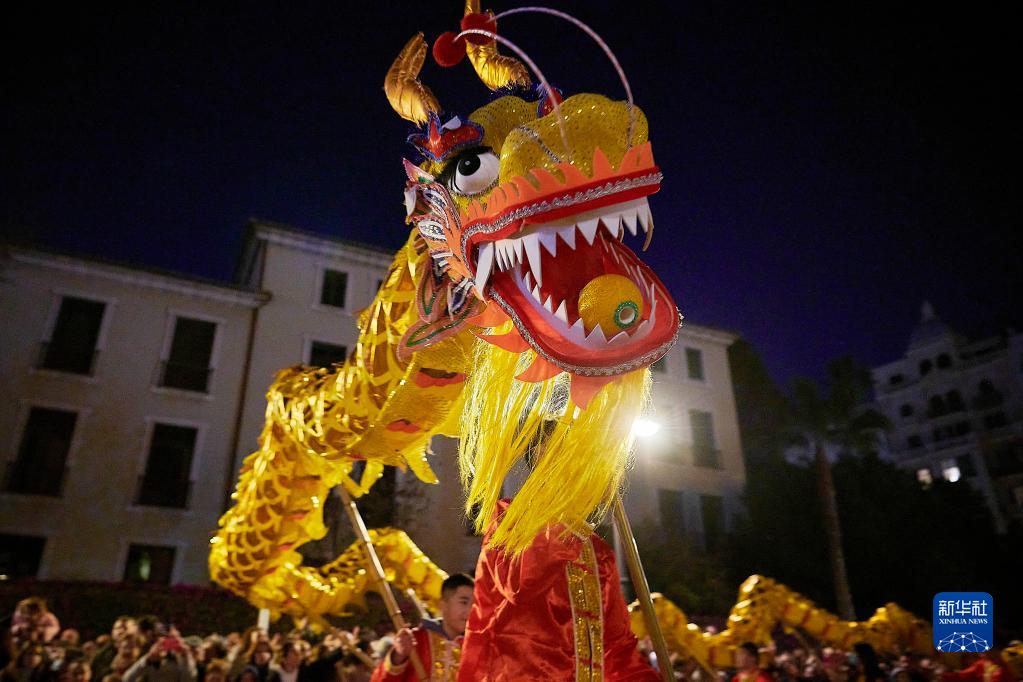 1月21日,舞龍隊在西班牙巴倫西亞春節游行上表演。