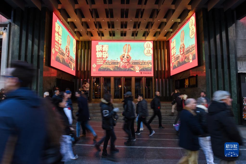 1月21日,西班牙馬德里市中心格蘭比亞大街上電子屏投影出的兔年春節海報。