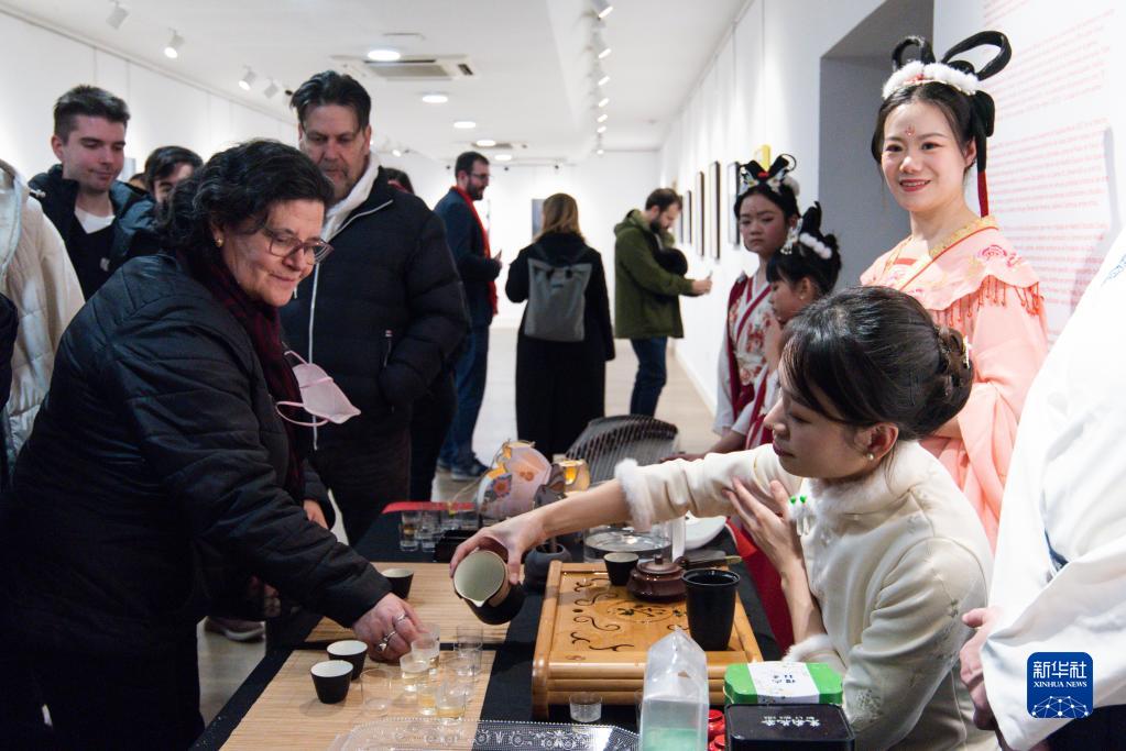 1月20日,西班牙馬德里當地民眾在春節慶?;顒?dòng)中品茶。