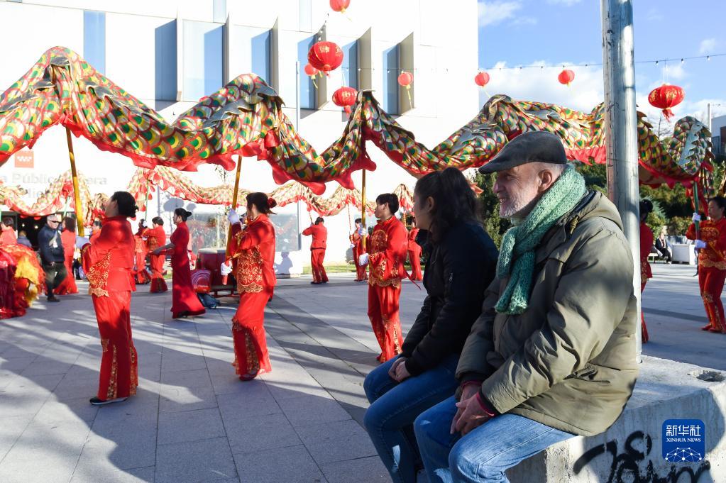 1月20日,西班牙馬德里當地民眾觀(guān)看舞龍表演。