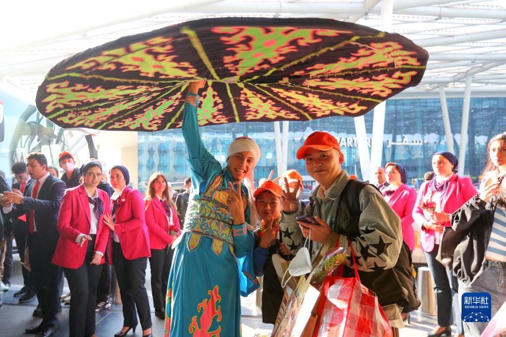 1月20日,在埃及開(kāi)羅國際機場(chǎng),表演埃及傳統舞蹈大裙舞的演員與中國游客合影。