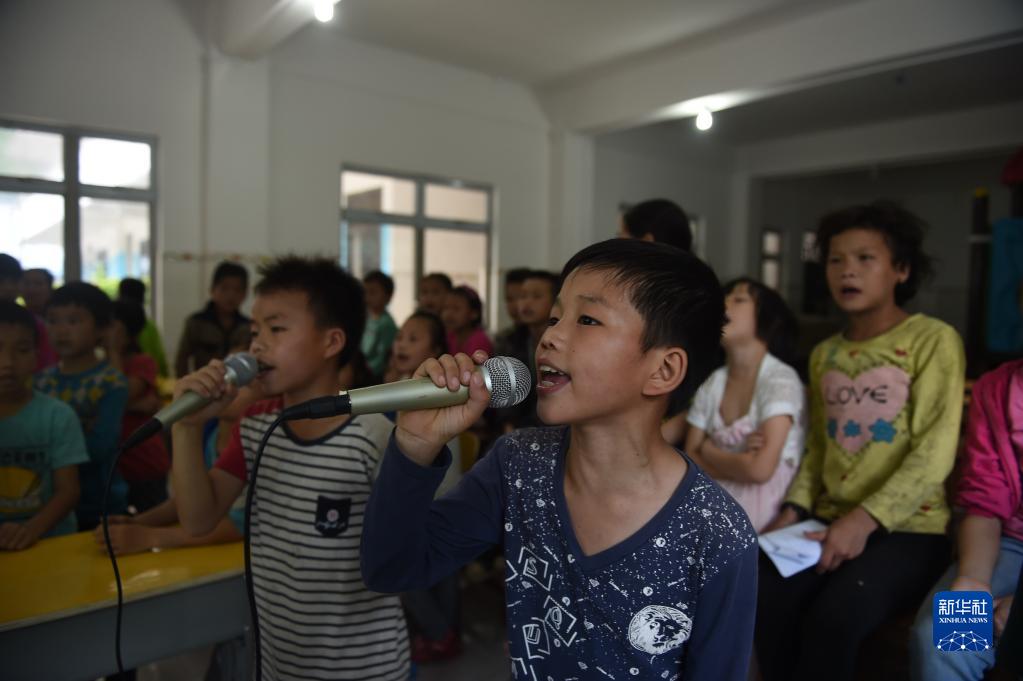 在弄勇小學(xué)讀五年級的蒙宣汰(前右)在學(xué)校聲樂(lè )室里排練(2016年5月26日攝)。