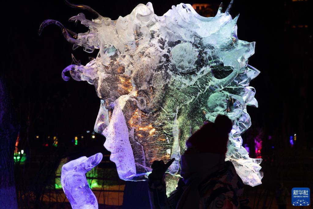 1月22日,游客在哈爾濱冰燈藝術(shù)游園會(huì )園區內觀(guān)賞冰雕。