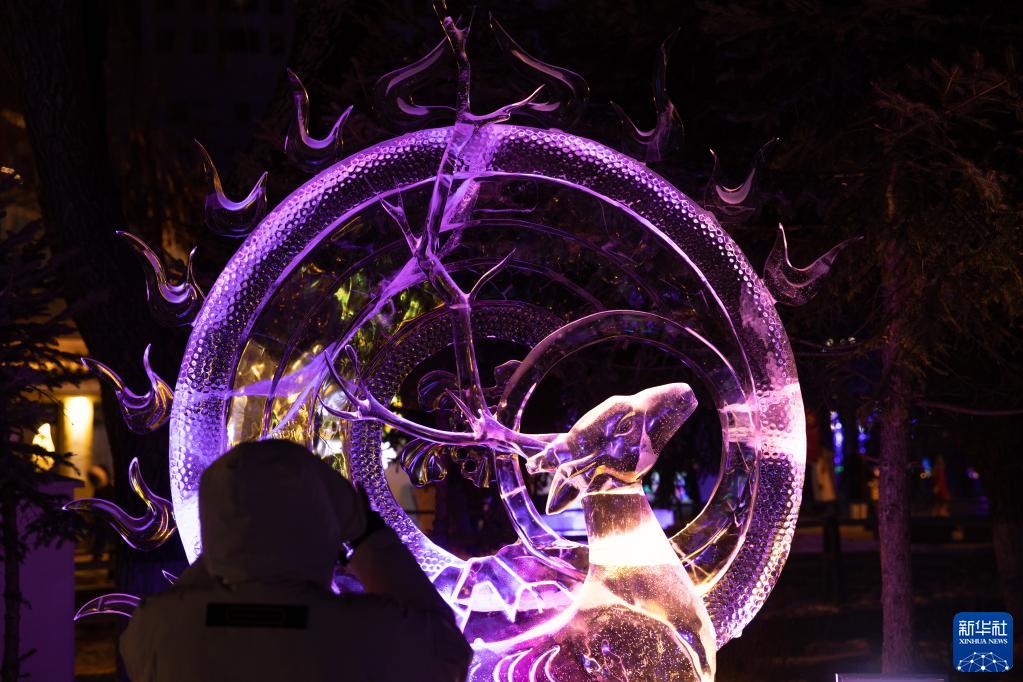 1月22日,游客在哈爾濱冰燈藝術(shù)游園會(huì )園區內觀(guān)賞冰雕。
