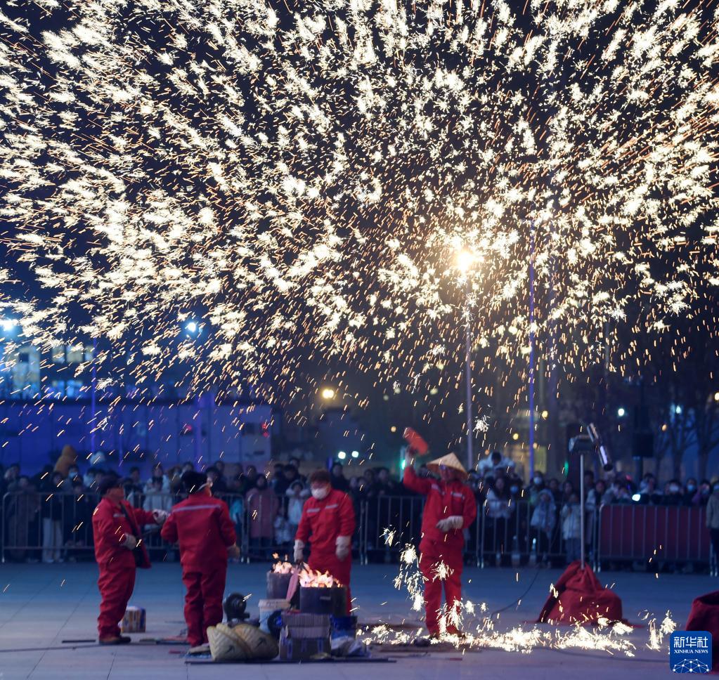 1月22日,在安徽省亳州市譙城區萬(wàn)達廣場(chǎng),民間藝人表演“打鐵花”。