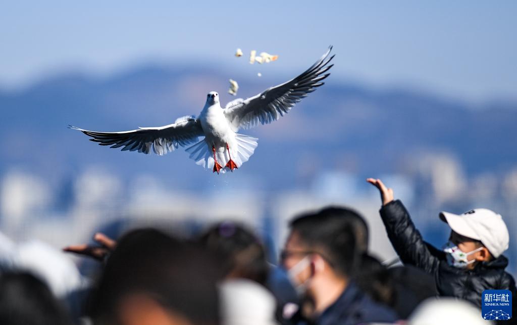 1月23日,游客在昆明市滇池海埂大壩上投喂紅嘴鷗。