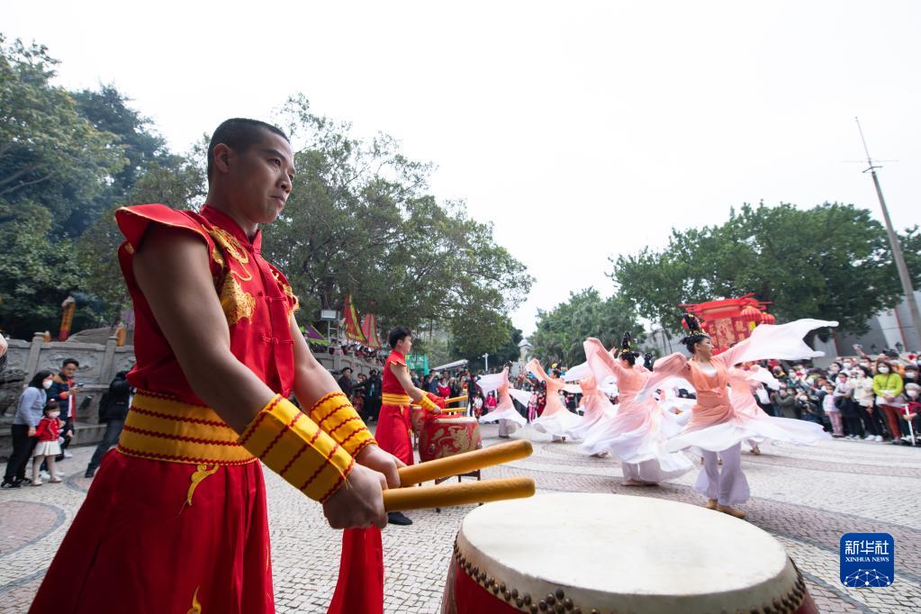1月23日,演員在澳門(mén)媽閣廟前表演鼓樂(lè )舞。