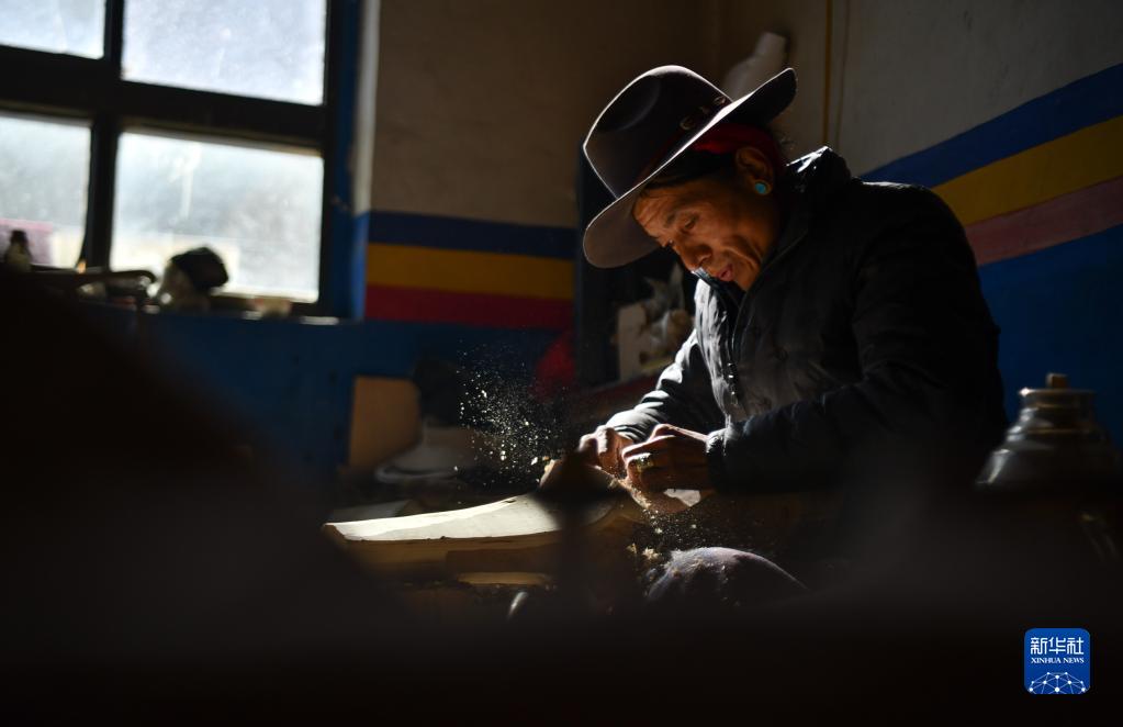 索朗瓊拉在制作扎念琴(1月19日攝)。