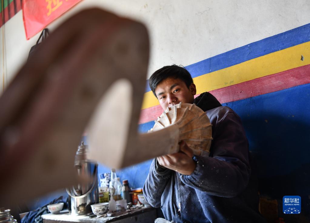 索朗瓊拉的大兒子在制作扎念琴(1月19日攝)。