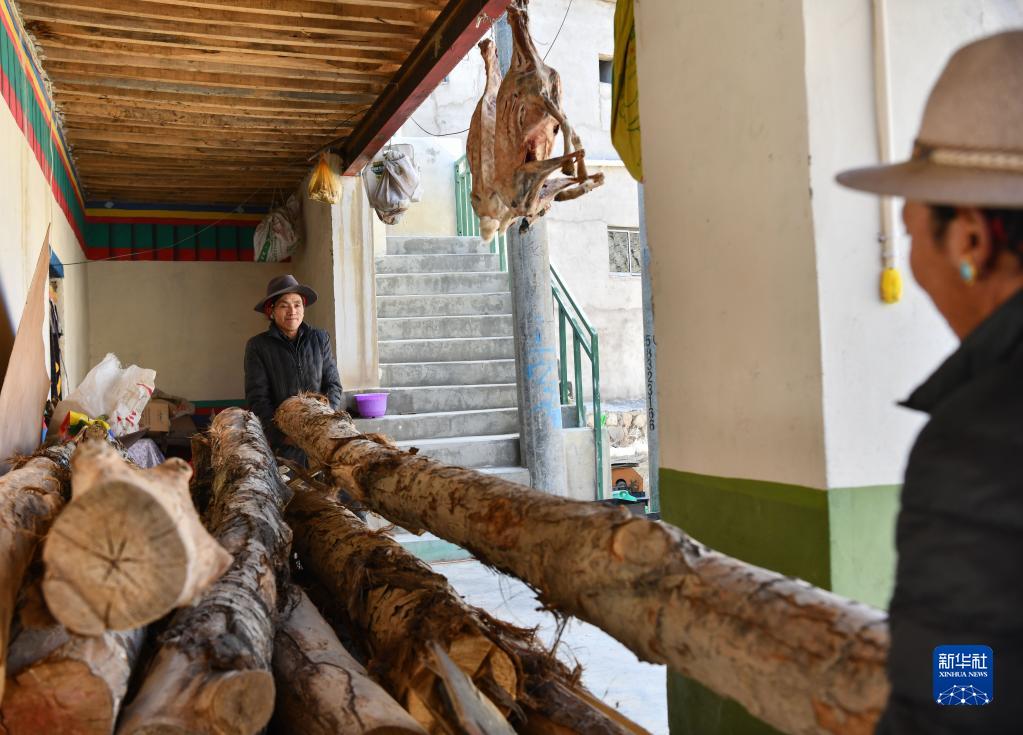 索朗瓊拉(左)和助手在挑選制作扎念琴的木材原料(1月19日攝)。