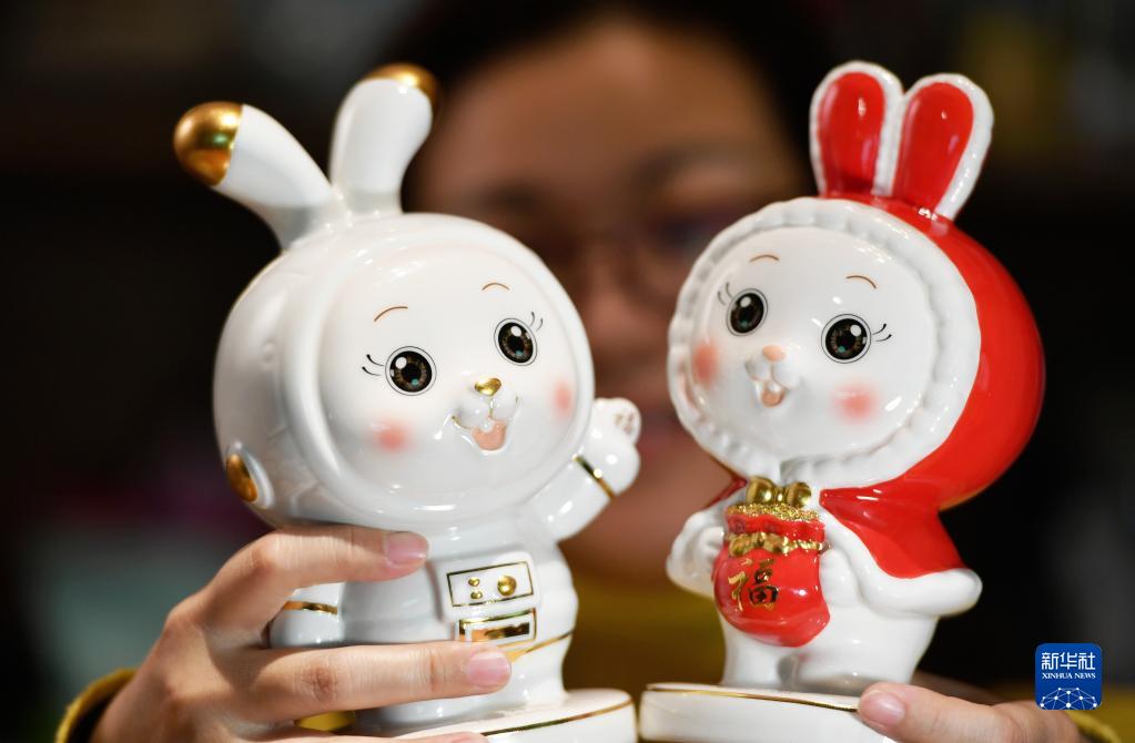 一名市民展示福建省泉州市德化縣陶瓷廠(chǎng)生產(chǎn)的陶瓷版兔年吉祥物“兔寶(右)和兔墩”(1月23日攝)。