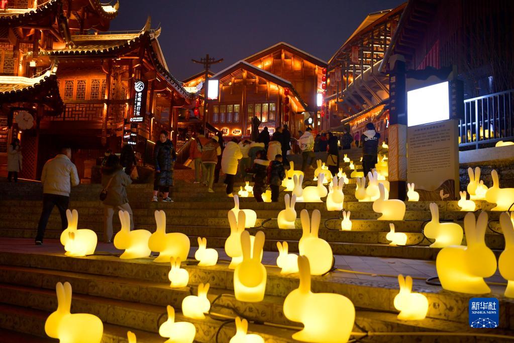 人們在湖北省恩施土家族苗族自治州宣恩縣城貢水河畔觀(guān)看兔燈(1月22日攝)。