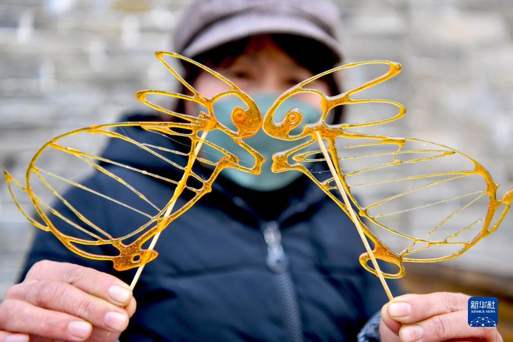 在安徽省亳州市花戲樓景區,民間藝人在展示制作的糖畫(huà)生肖兔(1月23日攝)。
