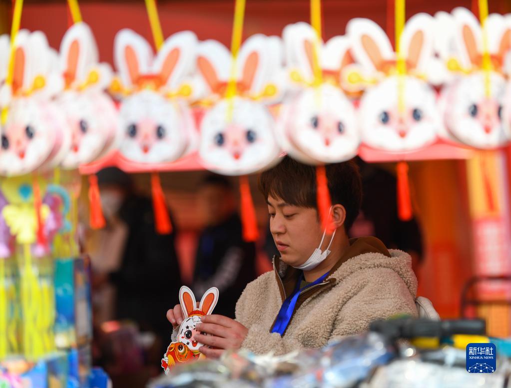 成都一名商家在拼裝兔子掛飾(1月23日攝)。