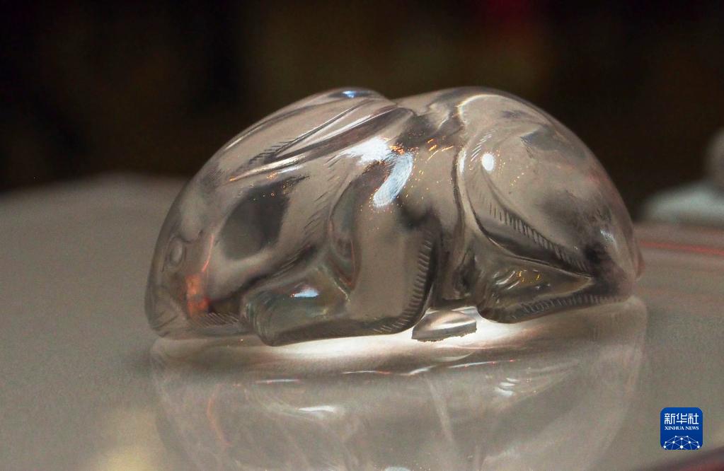 在上海博物館拍攝的元代水晶兔(1月22日攝)。元代水晶兔于1994年在上海市松江區圓應塔地宮出土。兔雙眼為圓圈狀,眼梢線(xiàn)向左右延伸,抿嘴,鼻子、胡須和四爪均用陰刻粗線(xiàn)條勾勒,兔毛以平行的細短陰線(xiàn)刻飾,裝飾性強。腹背豎穿一孔,可系可佩。整體似作覓食狀,質(zhì)樸敦實(shí)、憨態(tài)可掬。