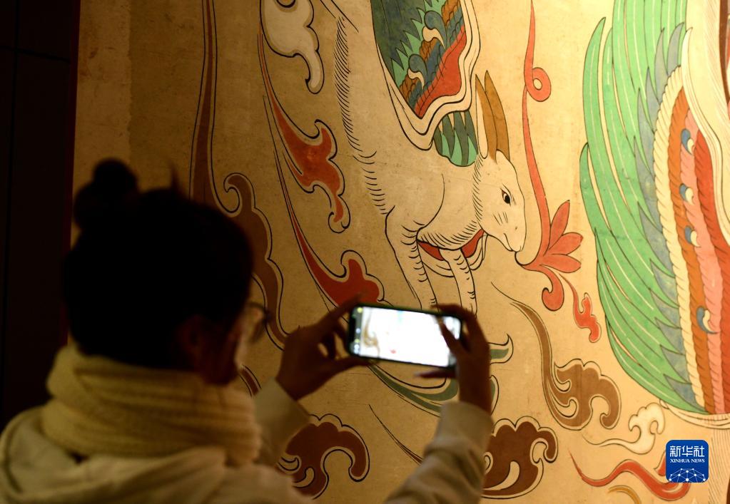 市民在河北博物院壁畫(huà)展廳拍攝壁畫(huà)中的羽兔(1月23日攝)。