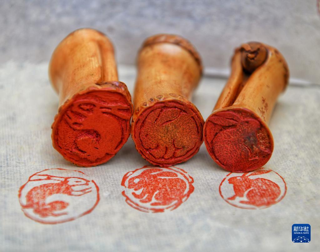 福建省武夷山市武夷竹刻傳承人張棟華用毛竹根雕刻的兔年印章(1月19日攝)。