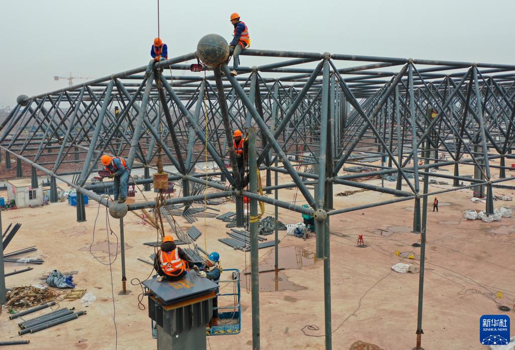 1月23日,在重慶兩江新區新能源汽車(chē)產(chǎn)業(yè)園基礎設施配套項目現場(chǎng),工人在進(jìn)行鋼結構施工作業(yè)(無(wú)人機照片)。