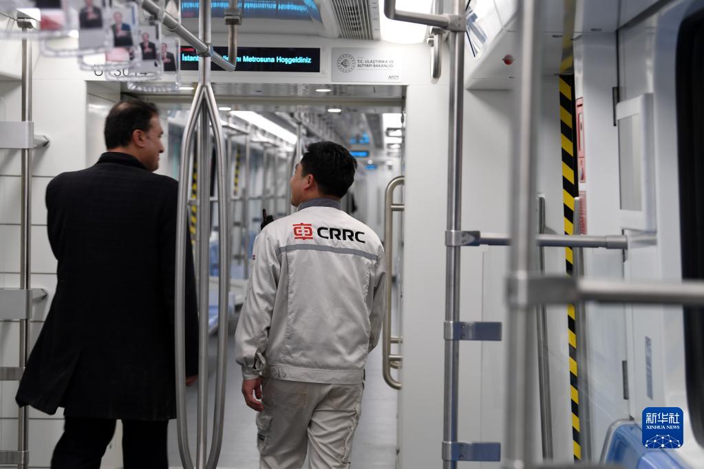 1月22日,工作人員在伊斯坦布爾新機場(chǎng)線(xiàn)地鐵列車(chē)內交談。