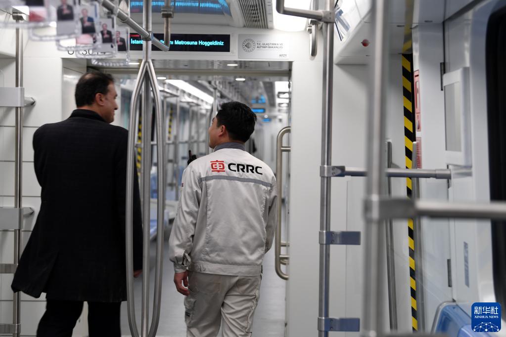 1月22日,工作人員在伊斯坦布爾新機場(chǎng)線(xiàn)地鐵列車(chē)內交談。