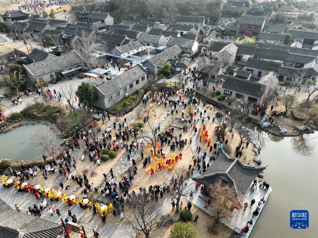 1月23日,市民和游客在盱眙第一山歷史文化街區觀(guān)看舞龍表演(無(wú)人機照片)。